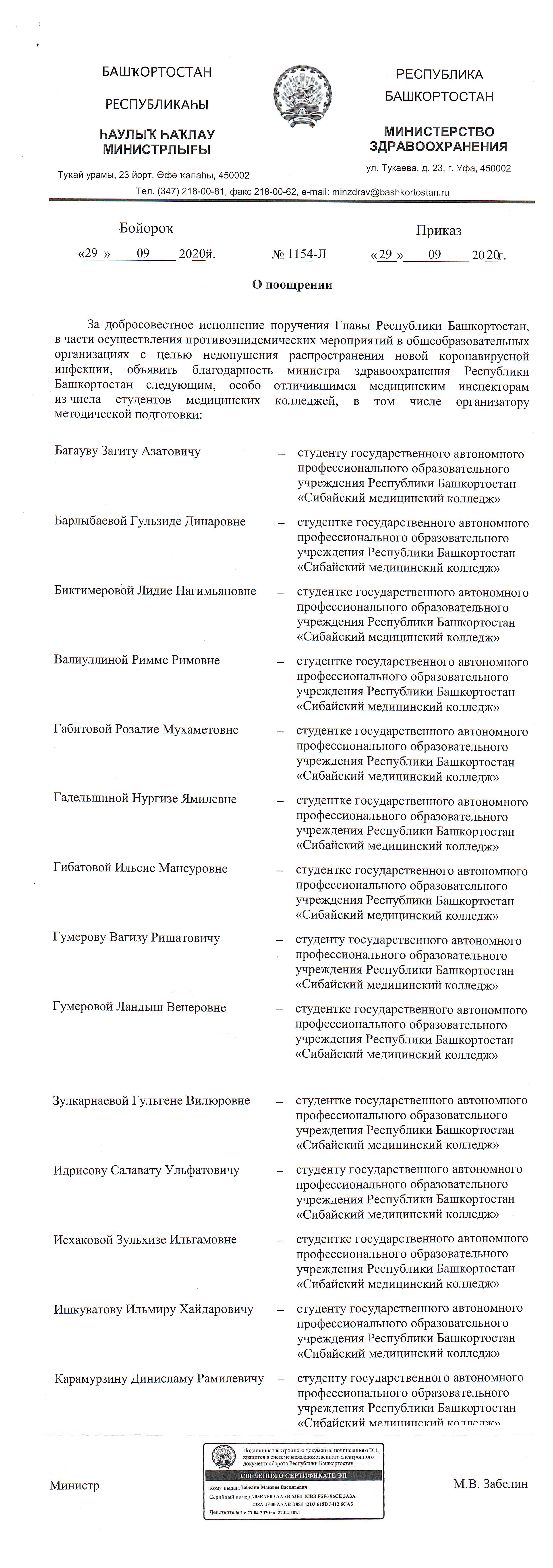 5 декабря 2020 года в Международный день волонтера состоялось награждение Почетными грамотами Главы администрации ГО г. Сибай, самых активных 22-х студентов, которые оказывают помощь медицинскому персоналу в ГБУЗ РБ ЦГБ г. Сибай в условиях борьбы с распространением