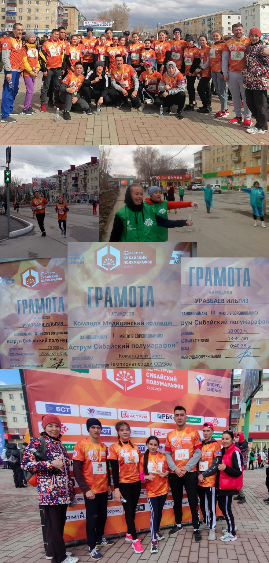 25 апреля проходил ежегодный традиционный пробег "Аструм Сибайский полумарафон", где команда из числа студентов нашего колледжа приняла активное участие и в командном зачёте заняла 1 место среди ССУЗов города. Так на дистанции 10км. студент 3курса Уразбаев Ильгиз занял 2 место в категории «Абсолют» г. Сибай и 3 место в возрастной категории 18-34 лет.